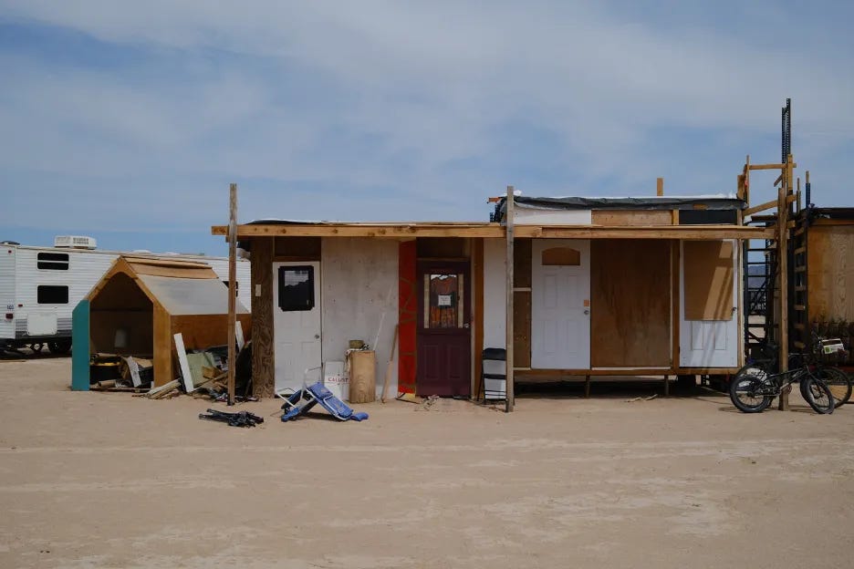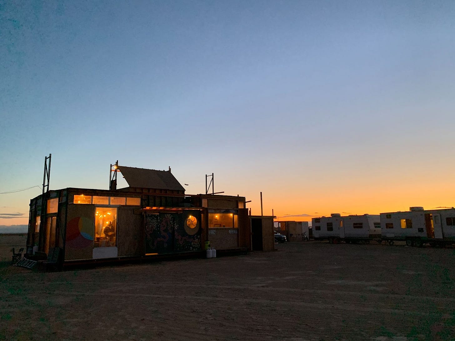 We will be located on Mars, in the desert about a mile from the nearest town. Last year, many Freesiders car camped or brought their own trailers or RVs. For those arriving without their own housing, we built dorm rooms. We’re planning on building some form of housing again this year — designs TBD. At minimum, we’ll have some kind of barrier to blunt the wind, some kind of roof cover to mitigate dust, rain, and sun, and places to insert water, power, and to hang out.